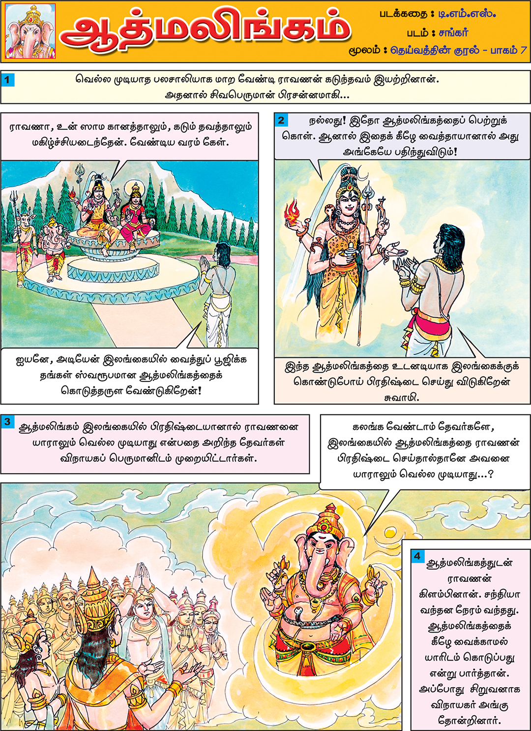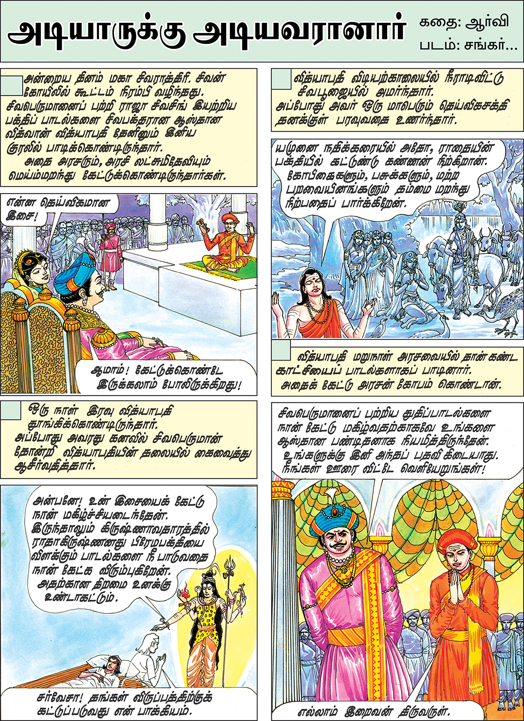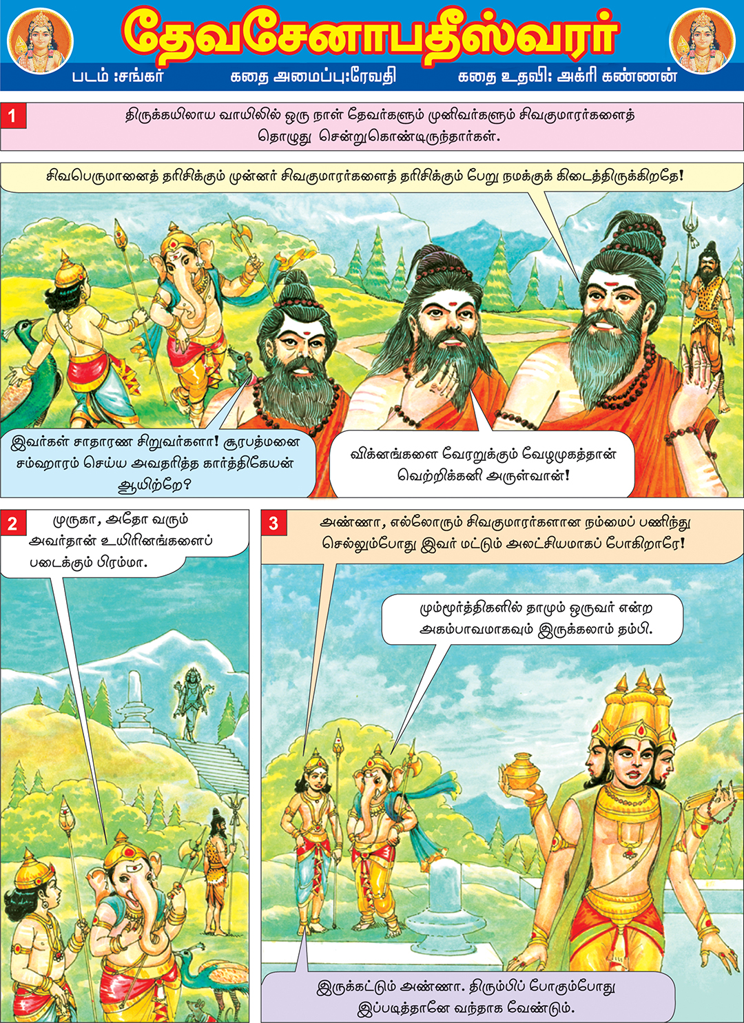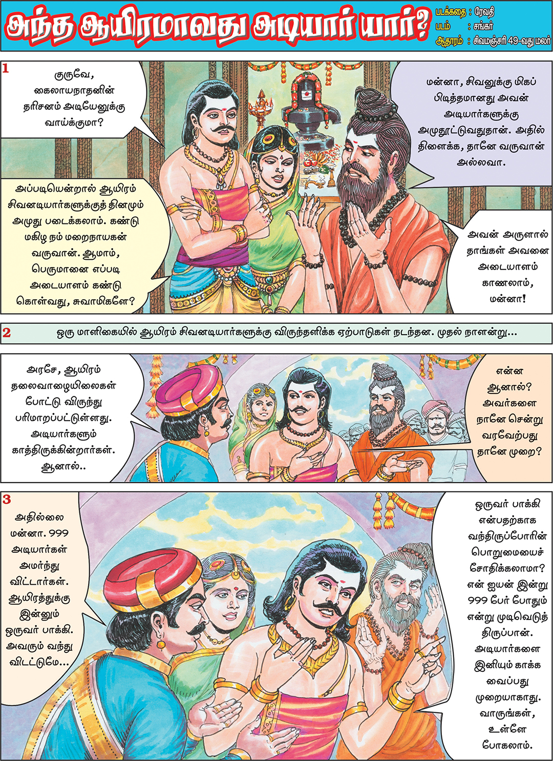 Sivaperuman Kathaigal This pictorial book contains many stories of Lord Sivaperumal lilai and His devotees. Some of the stories that are described are: Who is that Thousand Adiyar? Dhurvasarin Sapam Sivaperumanum Agathiyarum Meenakshi Kalyanam Velleeswaram