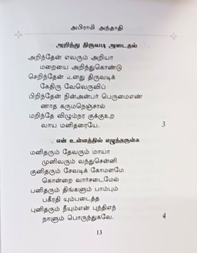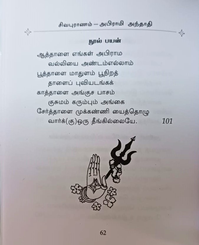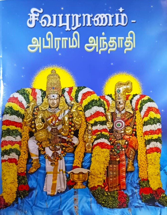 The small booklet contains two great hymns of great merit. Sivapuranam is in praise of Lord Siva. It is part ofTiruvachagam of Saint Manickavachagar. Abhirami Andhadhi is in praise of Goddess Abhirami (or Parvathi ) of Tirukkadaiyur. Sung by Abhirami Bhatta these 100 verses are unique - each verse begins with the last word of the previous verse.
